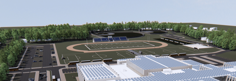 Exterior aerial generated photo of the proposed new high school building located off Pilgrim Parkway